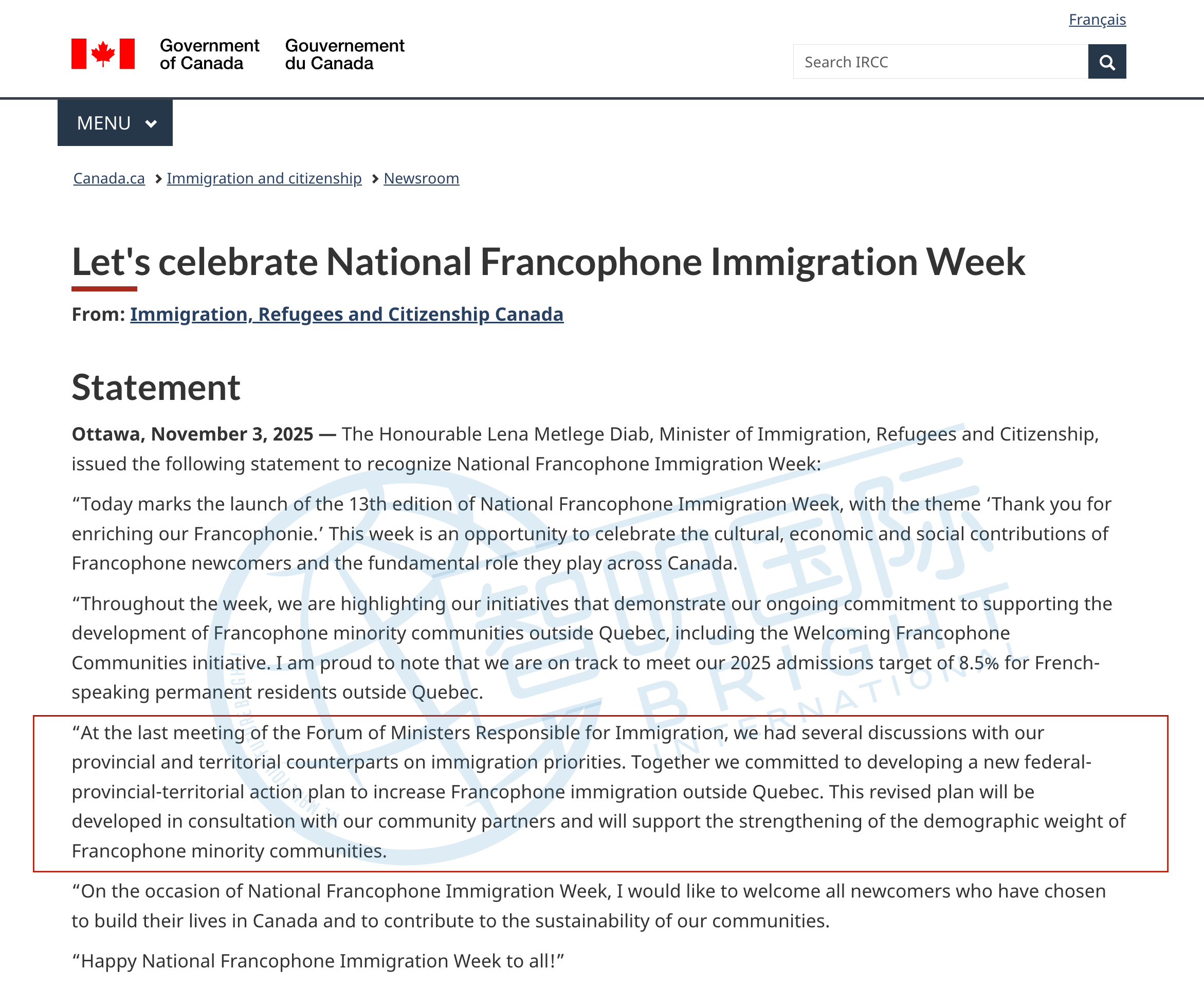 IRCC刚在「法语移民周」提到,2025年对“魁北克以外地区法语新移民”的目标为 8.5%。未来几年要持续提高法语移民比例,尤其鼓励在魁北克以外的法语新移民。